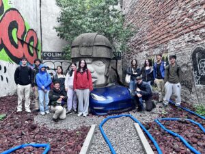 Students in front of a popular art piece: an Olmec statue crushing a Tesla.